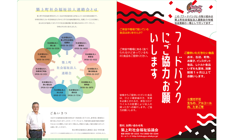 築上町社会福祉協議会様がフードバンク(ご家庭や職場にある食べられるけど余っている食品をご提供頂き、一人親家庭の方や新型コロナウイルスの影響により収入の減った方にお配りする事業です)を行っている事とどういう組織体制でやっているのかという事を宣伝する為に何か作りたいとの事で今回の形になりました。